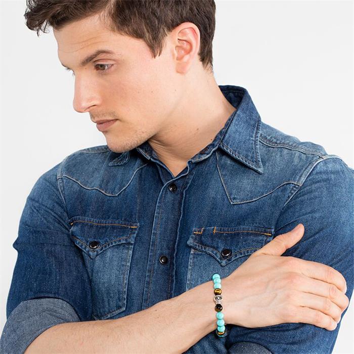 THOMAS SABO knows how to create trendy accessories! This stylish bracelet is the best proof of this. It consists of imitation turquoise balls and tiger's eye. As an eye-catcher, a sterling silver skull and an element with the brand logo are incorporated between the tiger's eye balls. Perfect to complete an ethnic or boho style, the bracelet is elastic, so you can put it on and take it off quickly. With its casual design, it can be worn by both men and women.Share