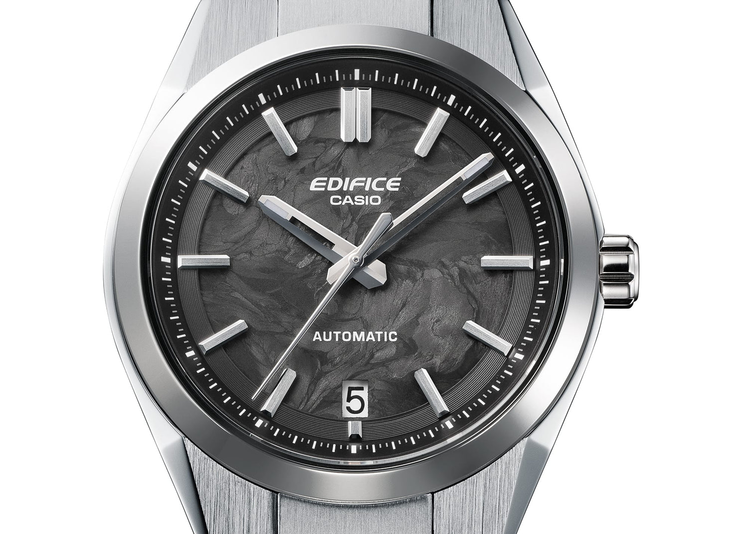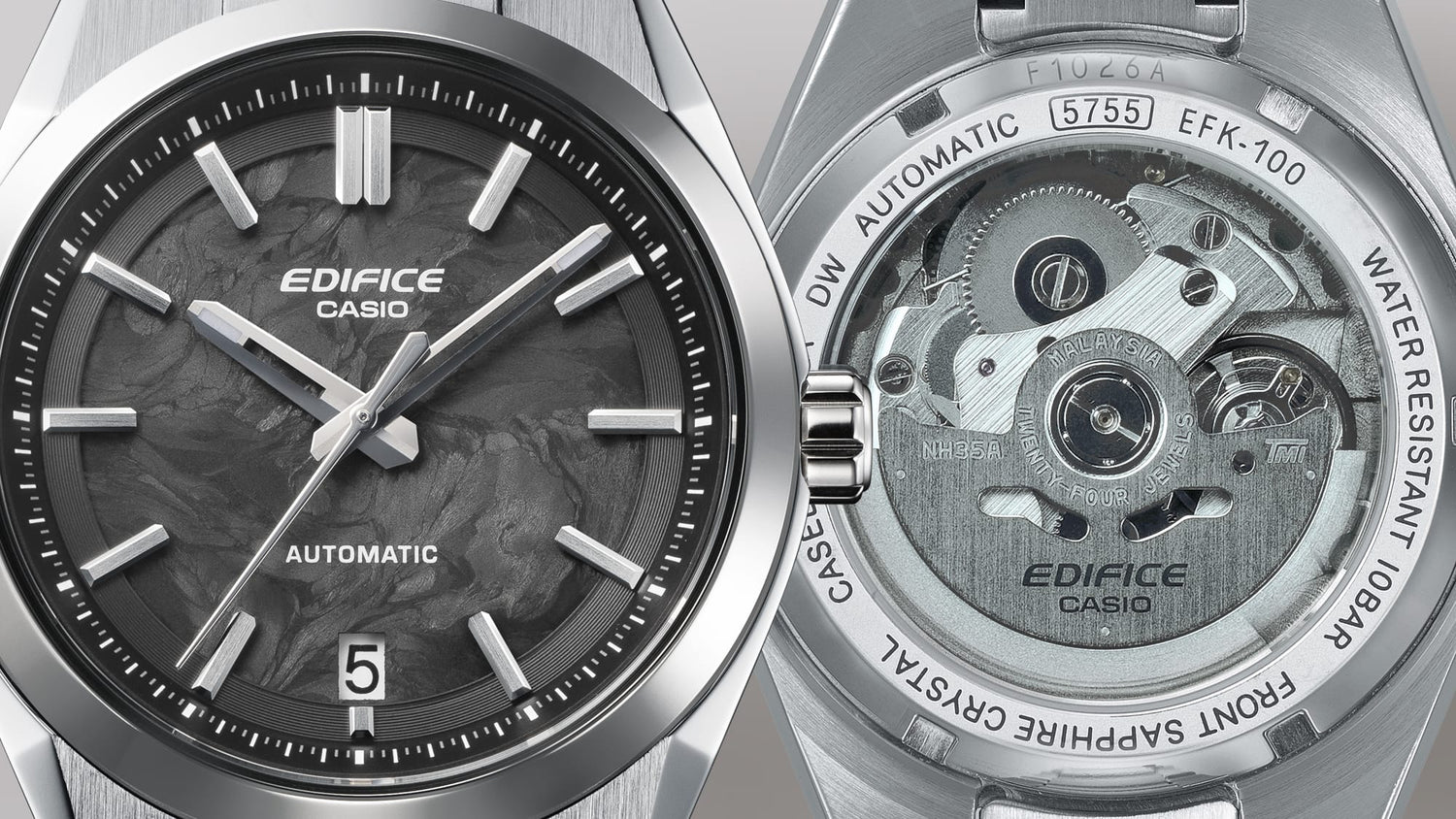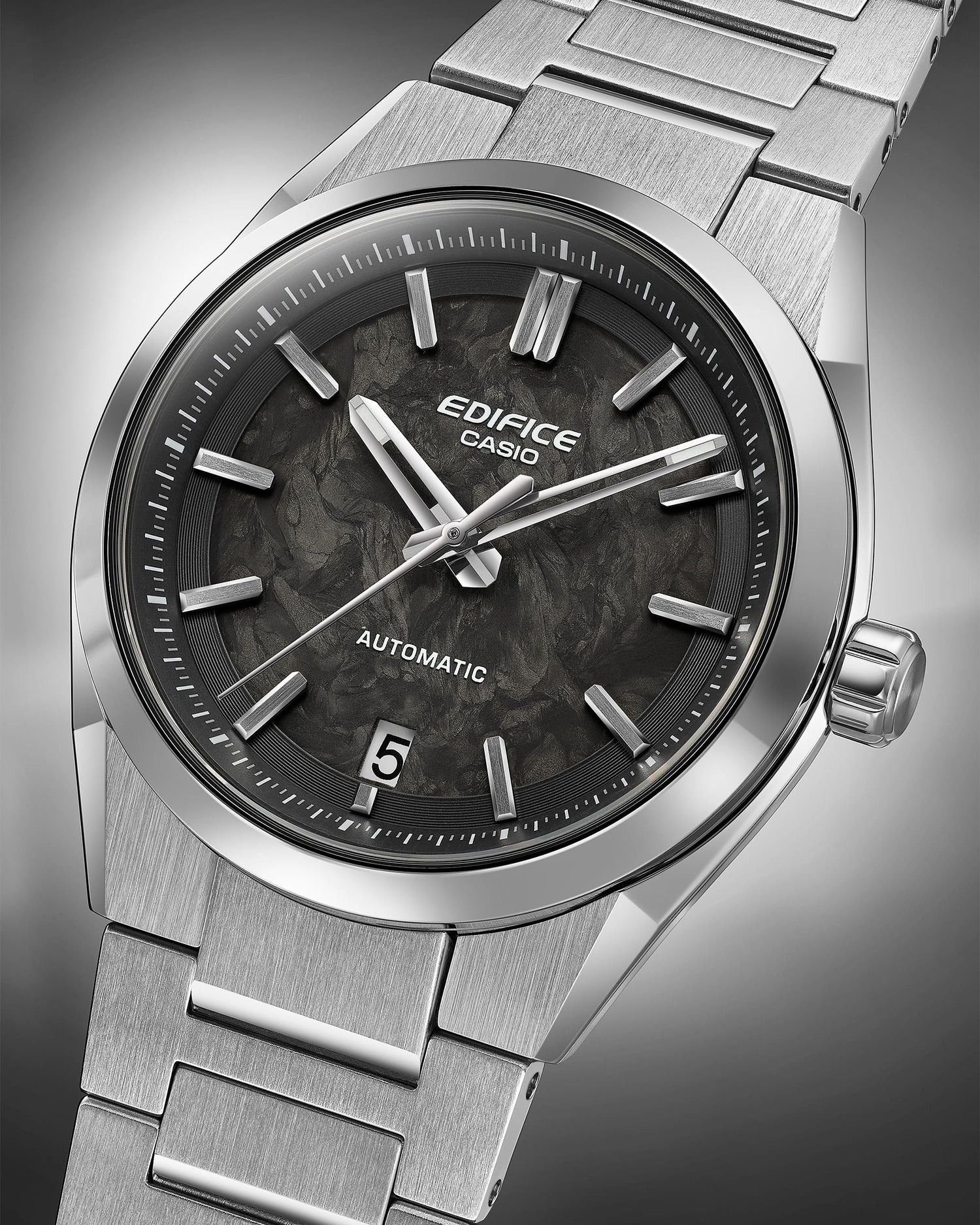 Introducing the analog EFK-100CD, a high-end EDIFICE that features forged carbon and a classic three-hand design. The dial features the state-of-the-art forged carbon used in high-end sports cars, capturing the exhilaration of a sports car speeding toward higher performance in a distinctly EDIFICE style. Forged carbon is a composite material of carbon fiber kneaded into resin and then forged at high temperatures under intense pressure, and it is both stronger and lighter than metal. The mechanical movement with 40-hour reserve powers the watch hands like a humming sports car engine, all housed in a compact 39mm case. The see-through case back reveals the movement in motion, reinforcing the unique appeal of a mechanical watch. The raised indexes, sharp case and bezel design, and sapphire crystal project premium quality all the way. Water resistance up to 100 meters leaves you free to focus on more exciting things. Designed to thrill the most passionate car enthusiast.
