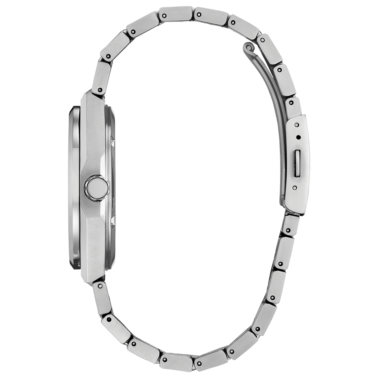 Pairing classic proportions and innovative technology with a distinctly modern style, we present our new Zenshin collection. Made with our proprietary material, Super Titanium™, which is five times harder and 40% lighter than stainless steel and is scratch- and rust-resistant, this sporty timepiece features a 39mm silver-tone Super Titanium™ case that is elevated with finely brushed and polished finishing while being secured to the wrist with an integrated matching bracelet. On the dial, a textured white colour is accented with an outer minute ring in black, with silver-tone details and luminous hands and markers. A combined day-date window at the 3 o’clock position adds daily utility and hints at the watch’s retro-style inspirations. Sustainably powered by any light with Eco-Drive technology and never needing a battery, this versatile watch is also water resistant to 100 metres. Calibre J800.