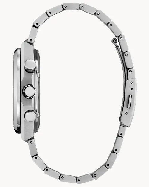 Pairing classic proportions with a distinctly modern style, meet the new Integrated Super Titanium™ series from Citizen. Featuring a 42.5mm silver-tone Super Titanium™ case paired with stylish stepped chronograph pushers and a stylized crown, the finely brushed and polished timepiece is secured to the wrist with a matching integrated bracelet. On the dial, a textured salmon colour is accented with an outer tachymetric scale and triple register configuration in black, with details in silver-tone and white put to use for the handset and applied indices. Features include running time, a split-second chronograph, 12/24 hour time, and date. Sustainably powered by any light with Eco-Drive technology and never needs a battery. Water resistant to 100 metres. Calibre B620.