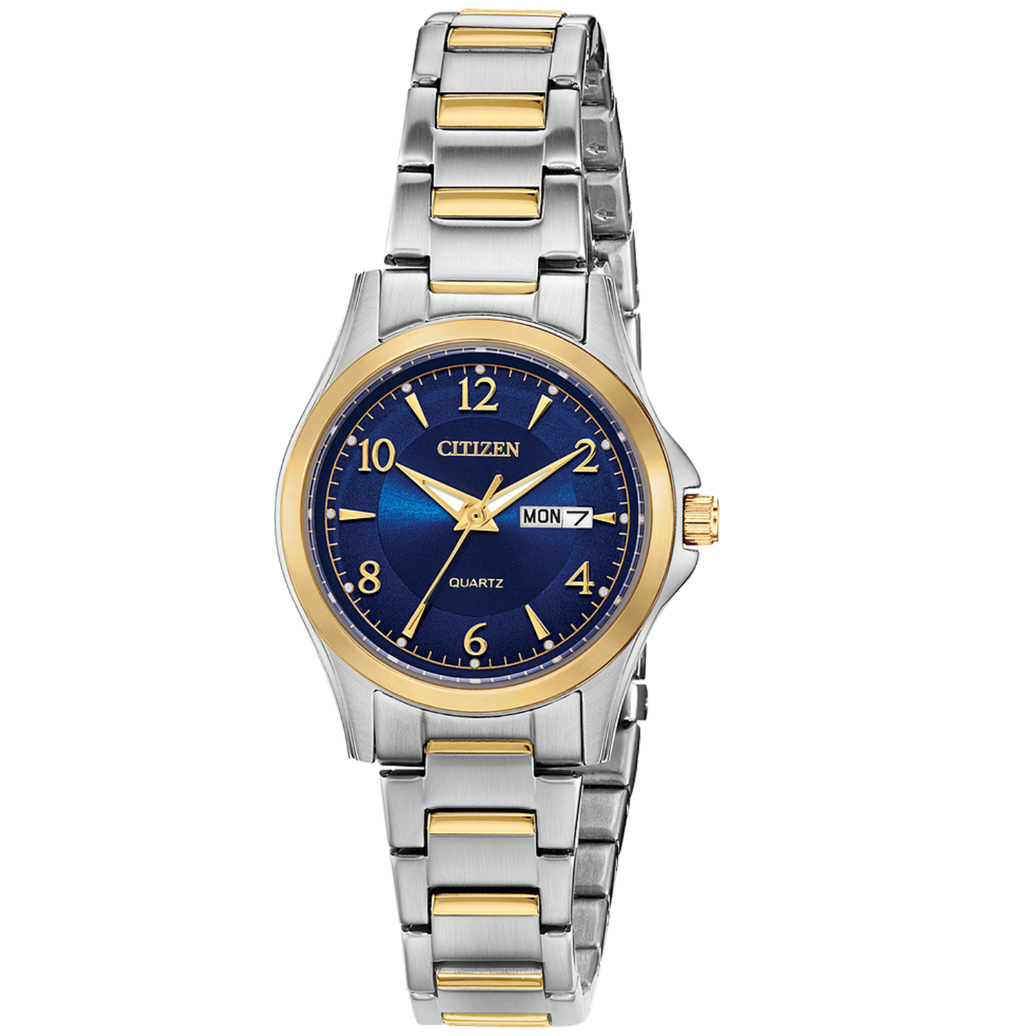 This CITIZEN® Quartz timepiece features a two-tone stainless steel case and bracelet with a blue dial. It is complete with a day/date function and luminous hands.