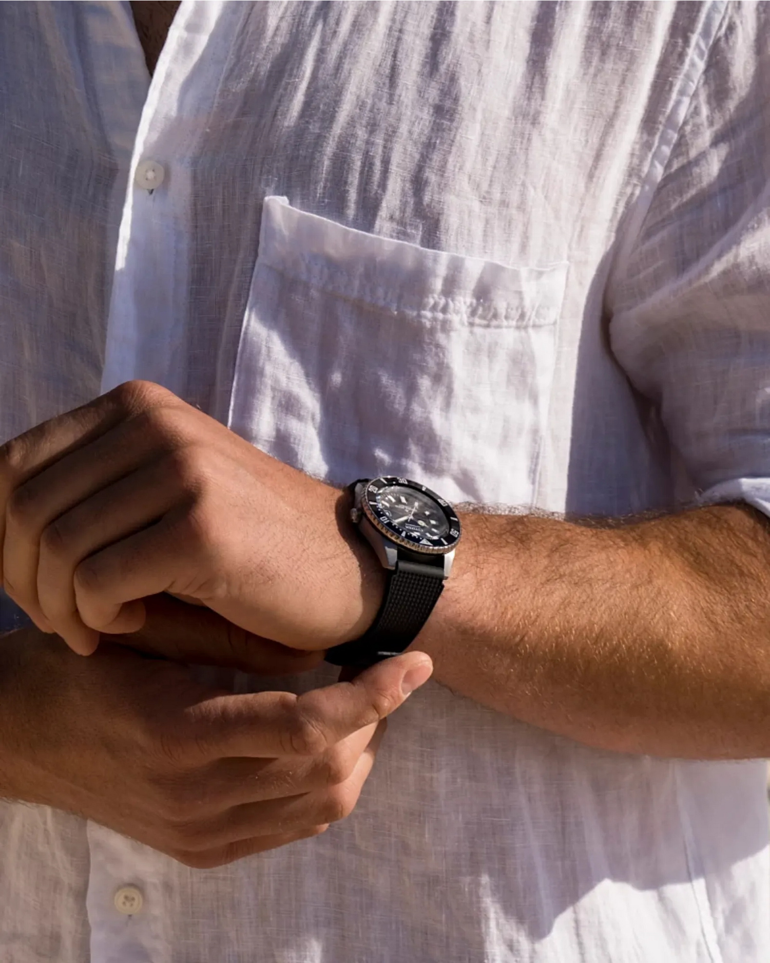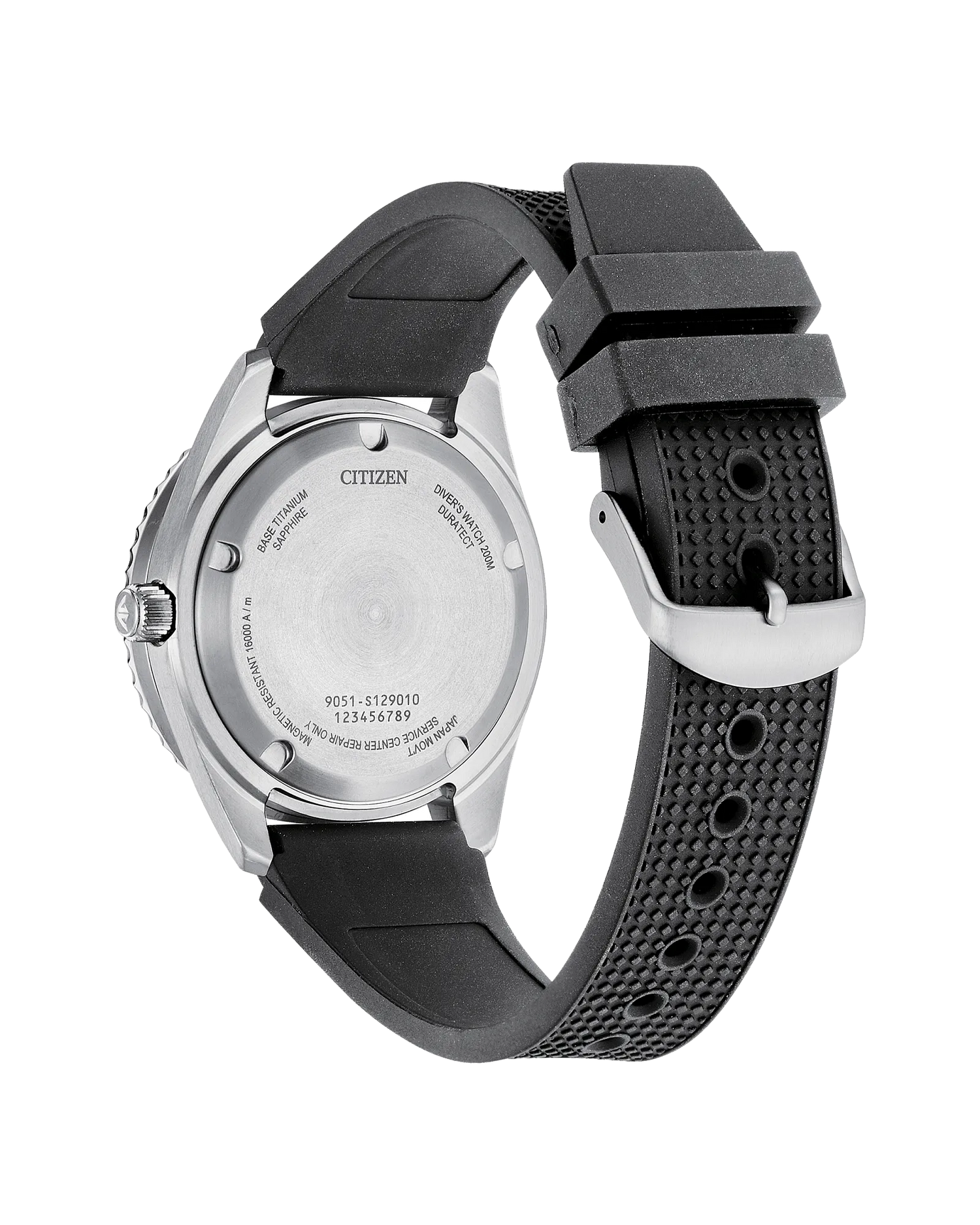 In a modern interpretation of the original 70’s dive watch, wear the new Promaster Mechanical Diver – the timepiece with a deep backstory. Inspired by the design of the 1977 Citizen Challenge Diver that was found on an Australian beach in 1983, the watch was covered in barnacles after having been submerged in the Pacific Ocean for years, but it was still ticking. The lightweight and scratch-resistant Super TitaniumTM case is complemented by a black dial with embossed hands and a classic green luminous for a vintage feel, a rotating elapsed-time bezel, and an anti-reflective sapphire crystal. The retro look is completed with the black polyurethane strap with a raised square pattern. This advanced timepiece with automatic movement features enhanced magnetic resistance to protect against external magnetic fields, as well as a 42-hour power reserve. This high-performance watch comes in an exclusive collector’s dive tank box, is ISO compliant and water resistant to 200 metres. Calibre number 9051.