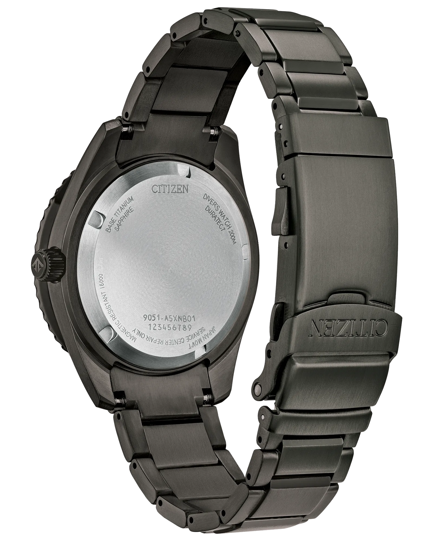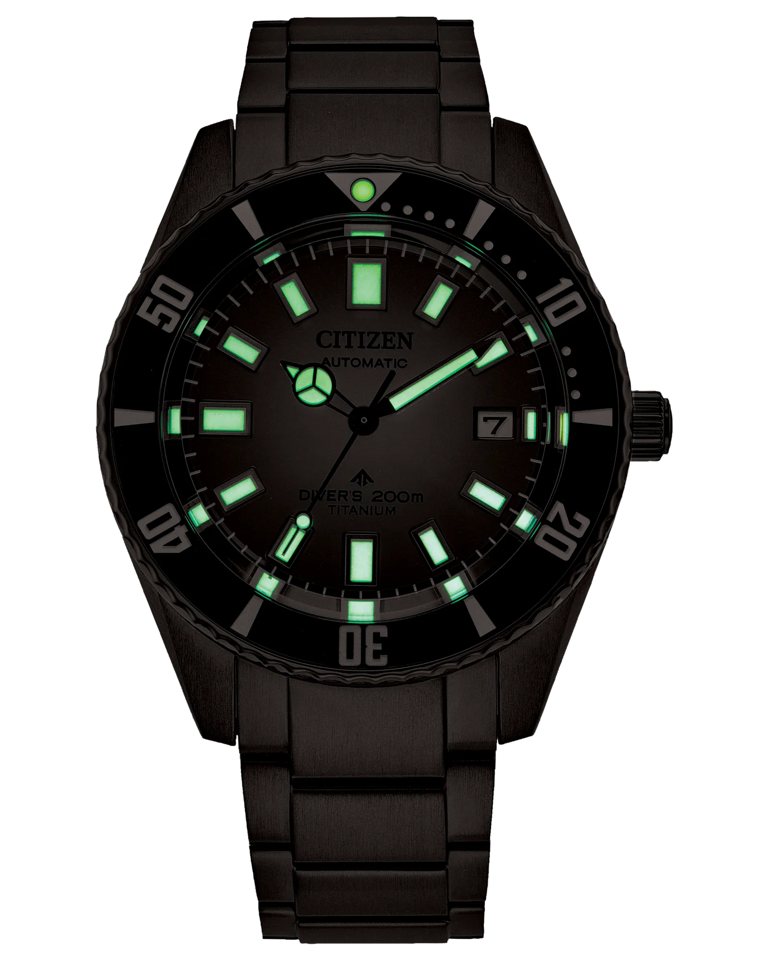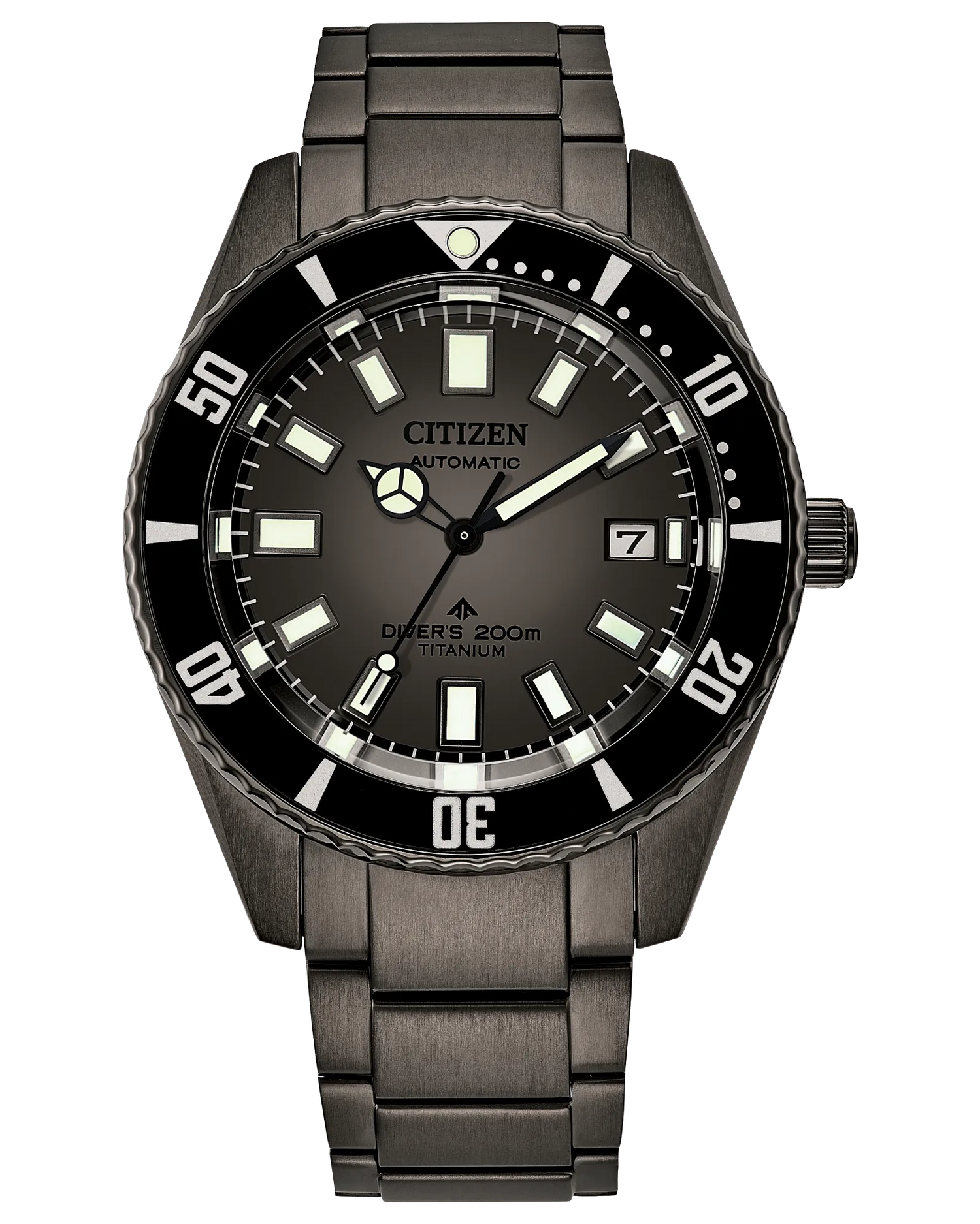 Submerge yourself in a new collection of Automatic Dive watches with a deep connection to Citizen’s history of innovation and proprietary technology. The new Promaster Automatic Diver 200M watch features Citizen’s Super Titanium™ construction with DLC coating that is both lightweight and ultra-durable. Measuring 42mm in diameter, the black case has an easy grip, rotating bezel and matching black titanium bracelet. The robust case surrounds a graduated grey dial with bright luminous hands and markers, contrasting nicely with the dark case and bracelet for a strong aesthetic of sport style and performance. This technically advanced and automatic sport watch is ISO compliant with a screw-down crown and water resistant to 200 metres. Calibre 9051.