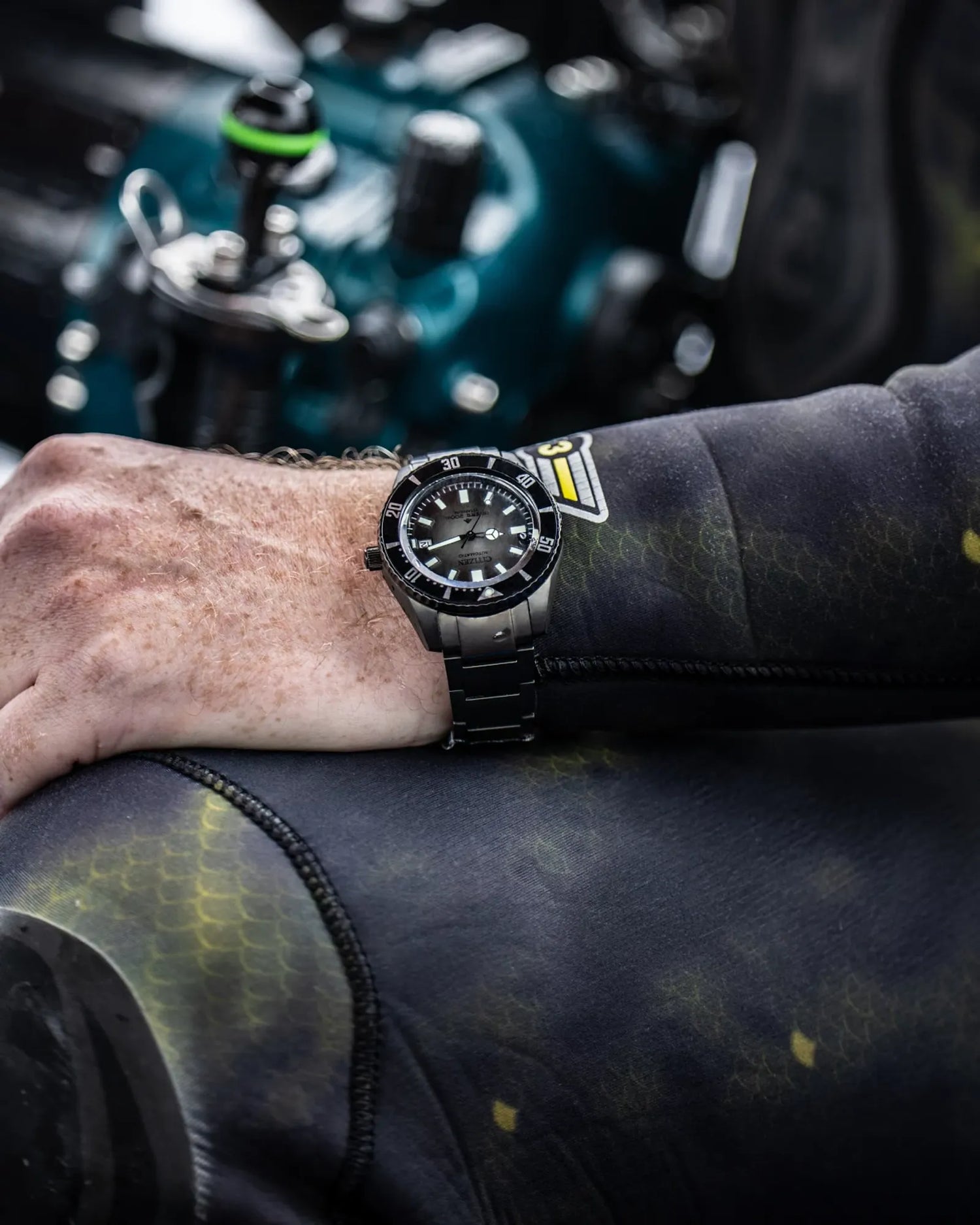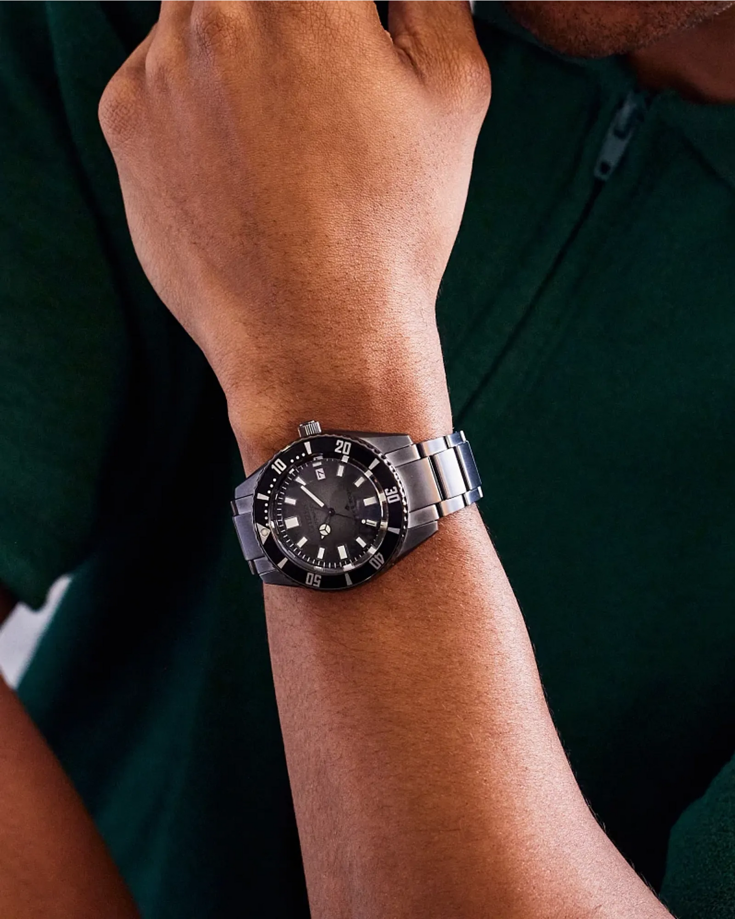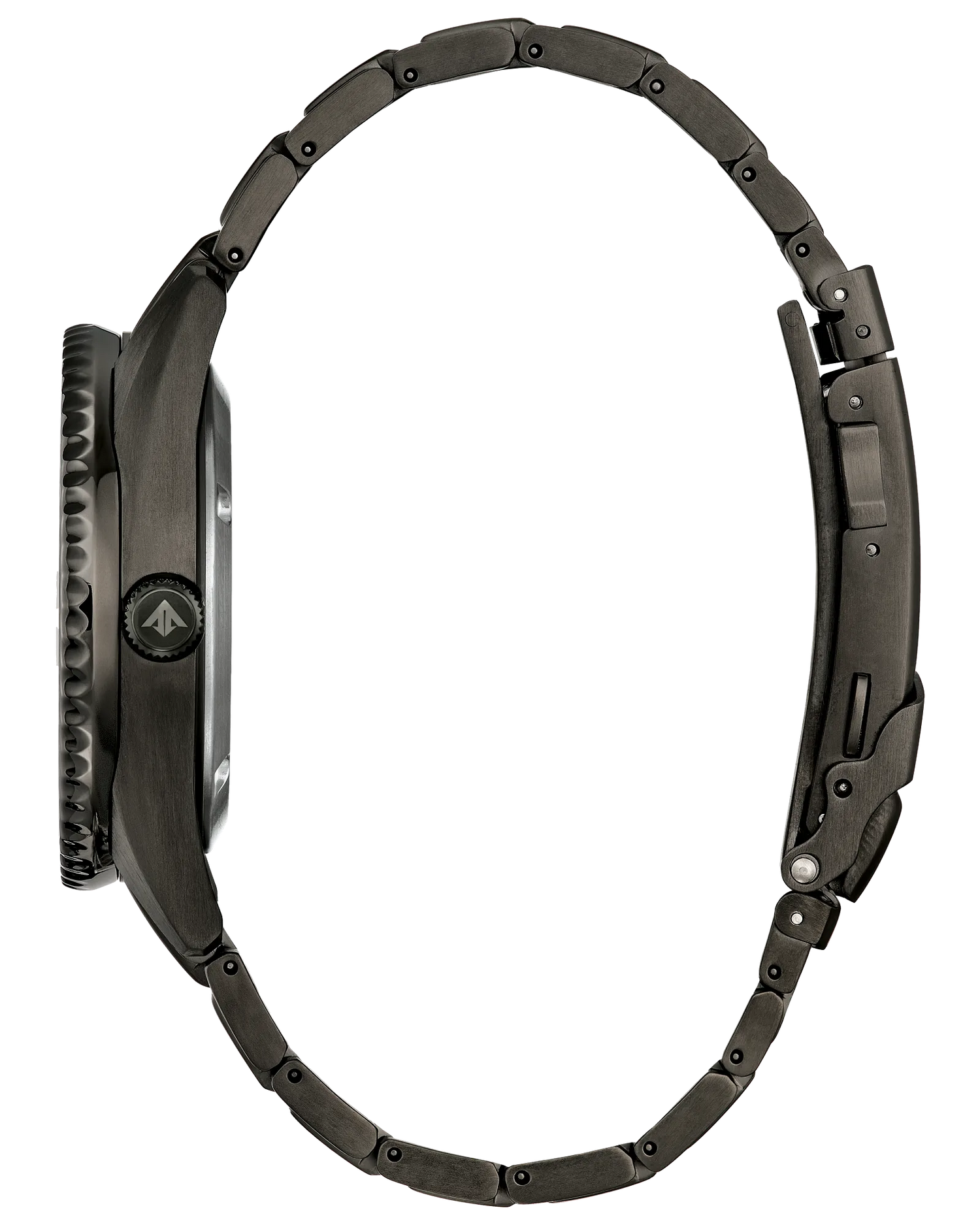 Submerge yourself in a new collection of Automatic Dive watches with a deep connection to Citizen’s history of innovation and proprietary technology. The new Promaster Automatic Diver 200M watch features Citizen’s Super Titanium™ construction with DLC coating that is both lightweight and ultra-durable. Measuring 42mm in diameter, the black case has an easy grip, rotating bezel and matching black titanium bracelet. The robust case surrounds a graduated grey dial with bright luminous hands and markers, contrasting nicely with the dark case and bracelet for a strong aesthetic of sport style and performance. This technically advanced and automatic sport watch is ISO compliant with a screw-down crown and water resistant to 200 metres. Calibre 9051.