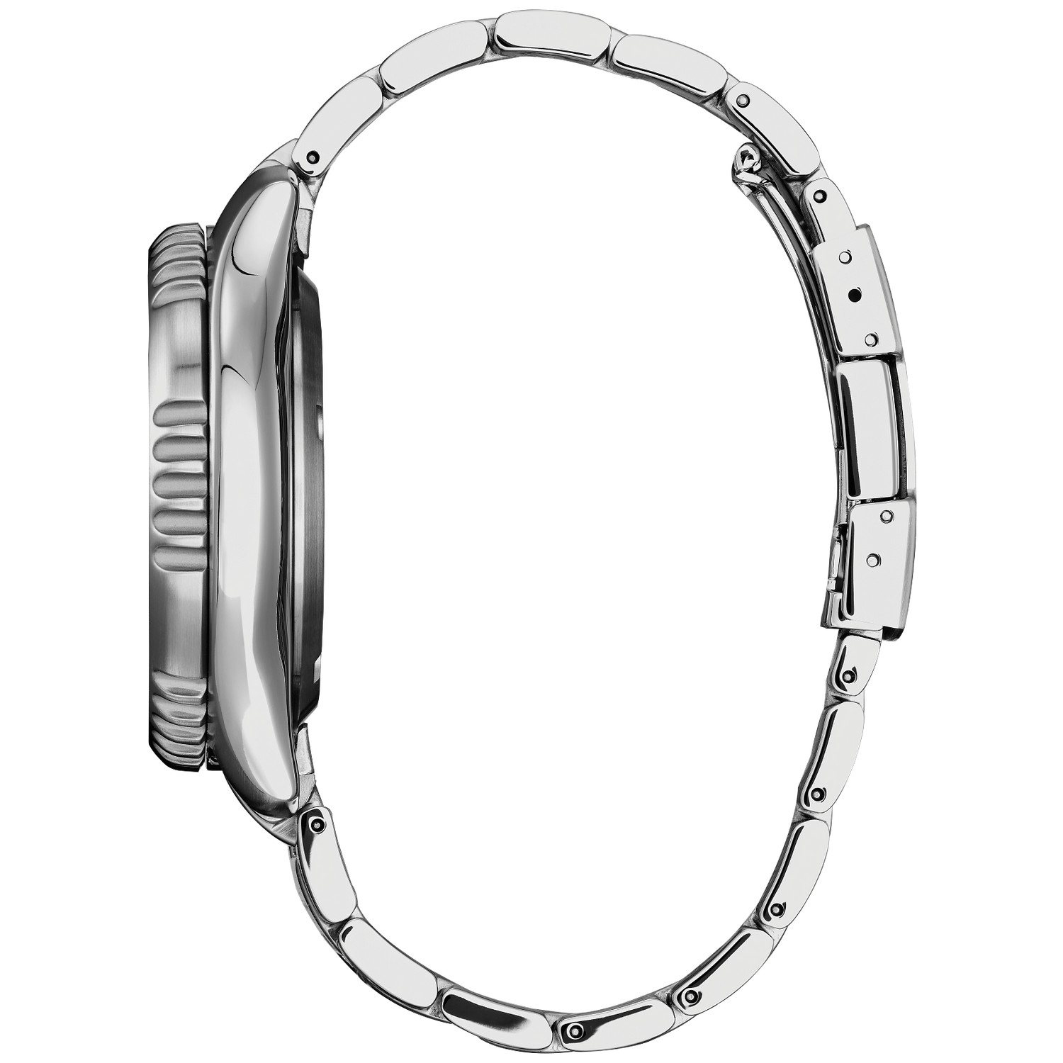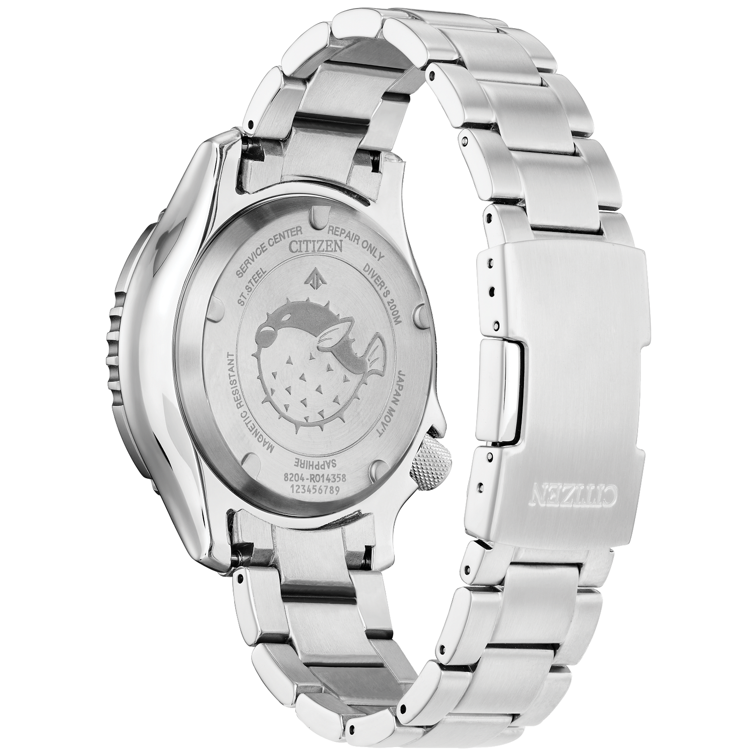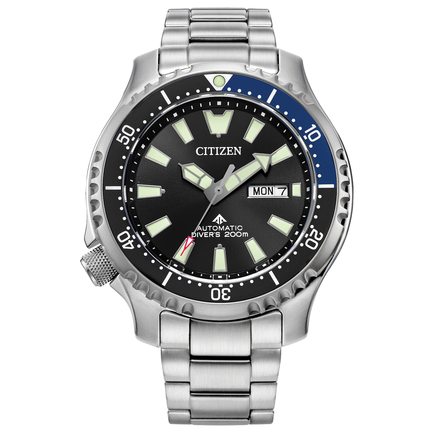 Paying homage to the classic, the newly reimagined Promaster Dive Automatic men’s watch by Citizen goes deeper into the history of the original version of this diving watch that was released in 1989 for the new generation of dive watch enthusiasts. Featuring a 3-piece, 44mm case, anti-reflective sapphire crystal and a silver-tone stainless steel case and bracelet. The black and blue rotating bezel with an easy grip aluminum ring surround the black dial and luminous hands and markers. This technically advanced and stylish sport watch comes in an exclusive collector’s dive tank box and is ISO compliant with a screw-down crown and water resistant to 200 metres. Calibre 8204.