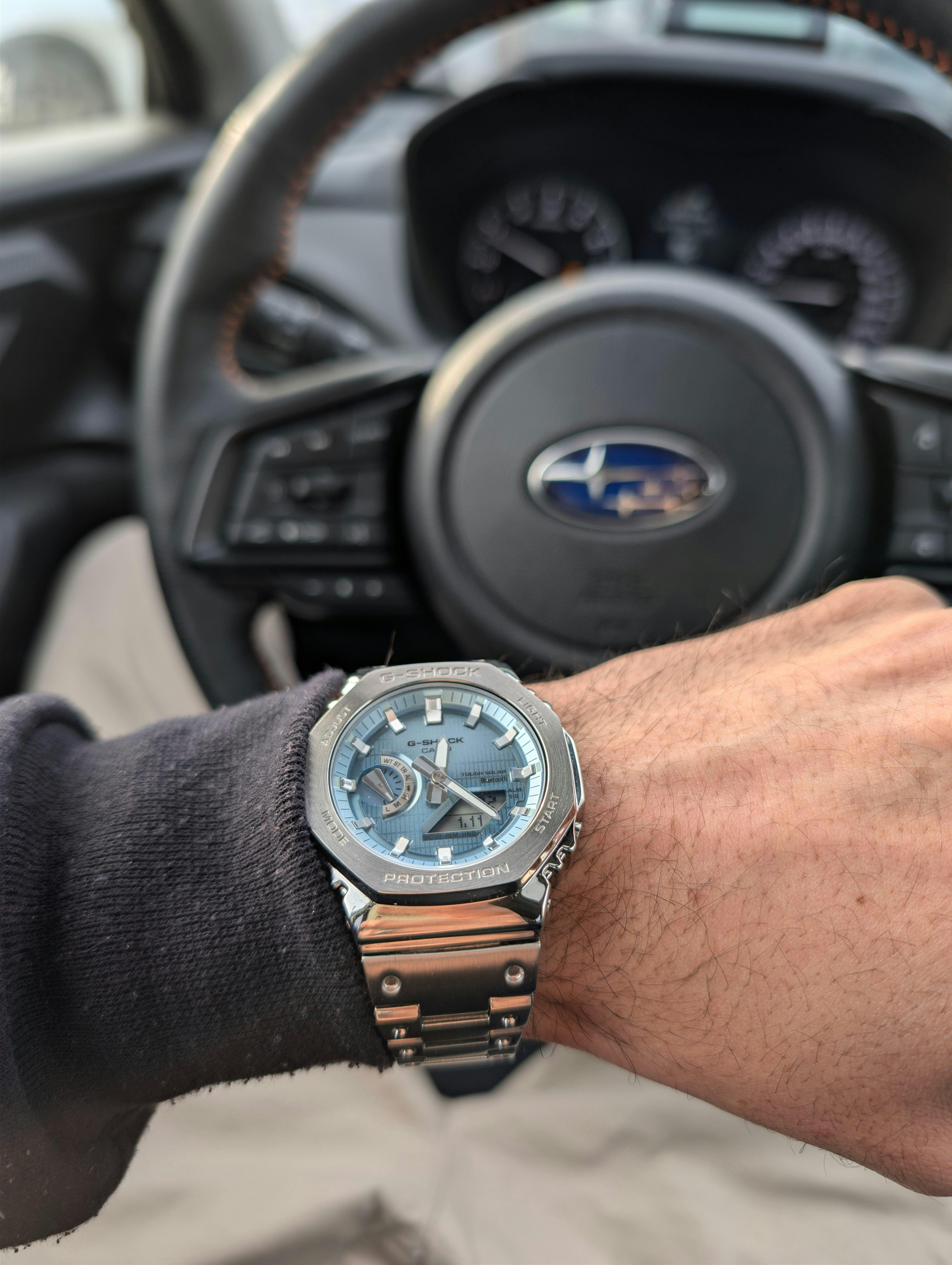 This model stands out in the 2100 lineup for merging the classic G-Shock aesthetic with smartphone connectivity and solar charging — eliminating regular battery changes and improving time accuracy via mobile link. The sleek metal bezel and striking ice-blue dial make it as stylish as it is functional.