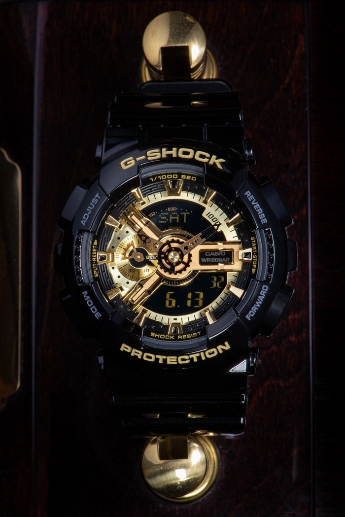 The G-Shock GA110GB-1A adds high gloss finishes and gold dials to its X-Large case designs for a visually powerful look. Black resin band analog and digital watch with gold face.