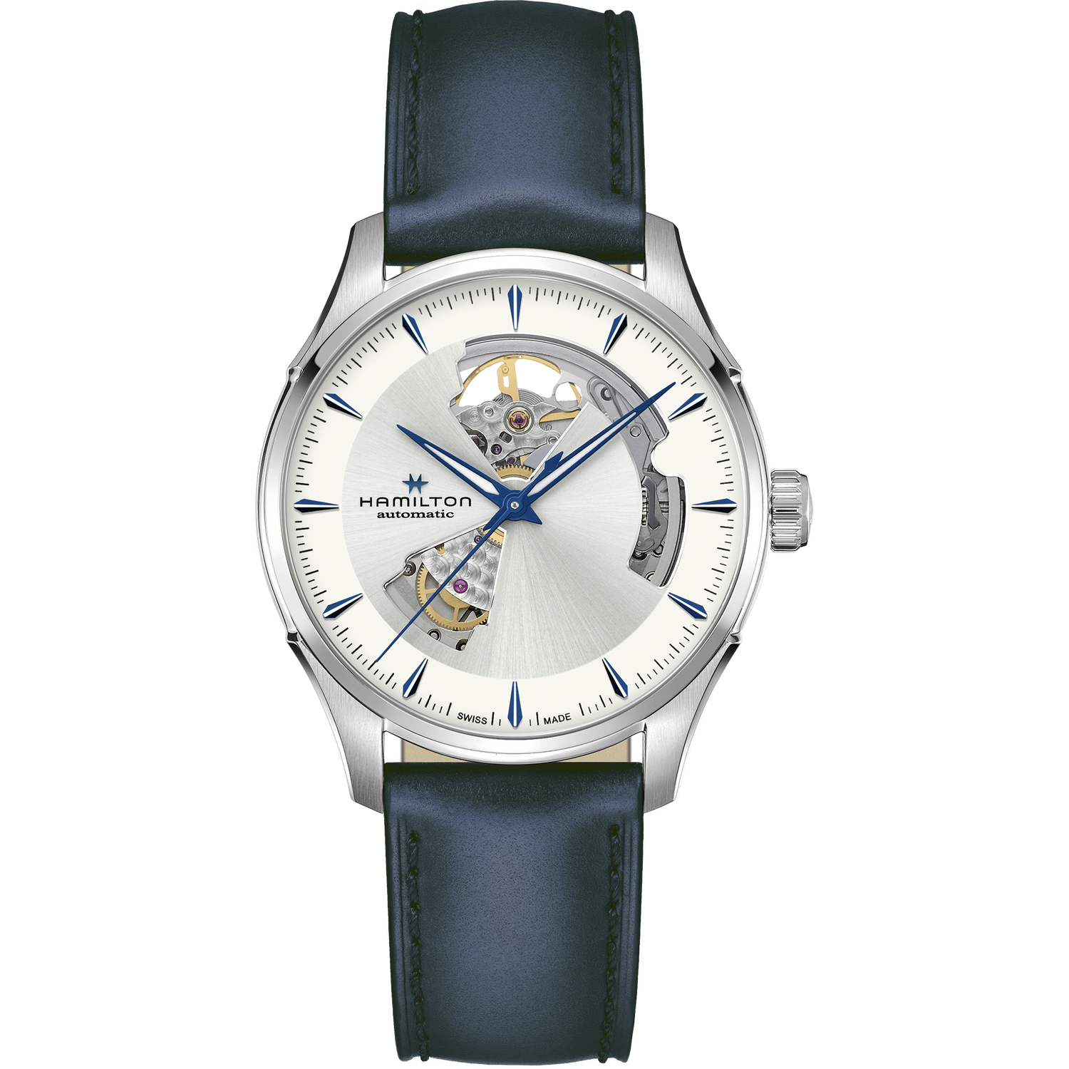 Classic watchmaking meets contemporary design in this blue and silver Jazzmaster Open Heart Automatic. Precision cutouts in its 40mm dial offer a glimpse at the Swiss-made movement inside and give this sophisticated timepiece a powerful personality all its own.