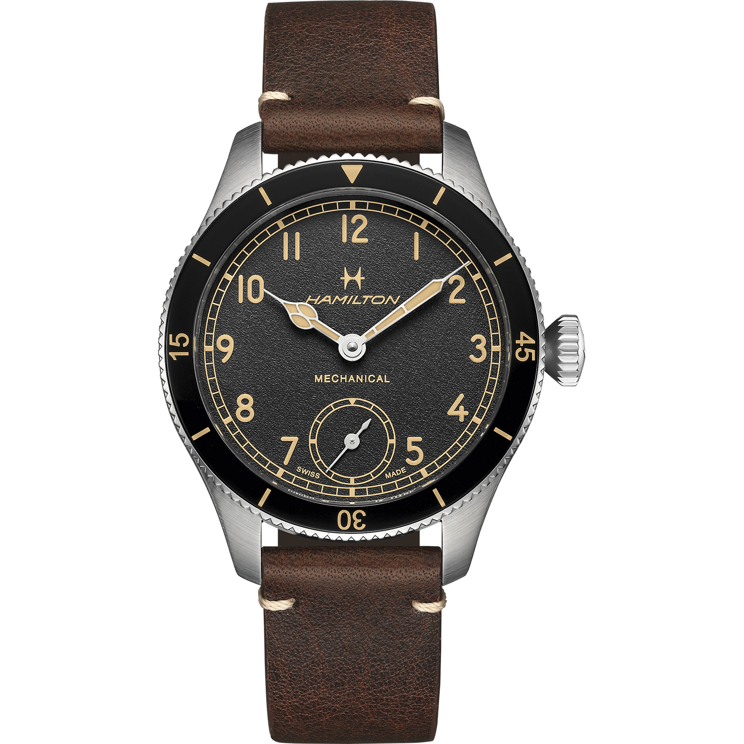 Inspired by the Model 23, a cutting-edge pocket watch used by U.S. soldiers during WWII, the Khaki Pilot Pioneer's distinctive design is a tribute to Hamilton's aviation and military heritage. The sporty yet refined pilot watch retains an indisputably technical feel with its handwinding mechanical movement, bi-directional rotating bezel and prominent winding crown. Available with a sleek stainless steel or unique bronze case, this 43mm timepiece is ready to fly.