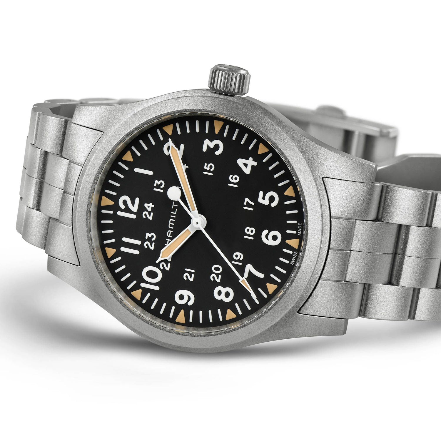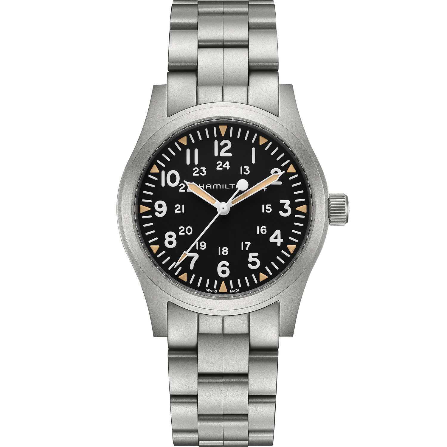 One of Hamilton's most iconic timepieces is now available with a larger case size. Powered by our exclusive hand-wound H-50 movement, the Khaki Field Mechanical 42mm stays true to form with a sandblasted stainless steel case and ultra-readable dial in white or black. Whether you wear this updated version of the original soldier's watch with a comfortable stainless steel bracelet or green textile NATO strap, its rugged and resilient design will keep you on time through every adventure.