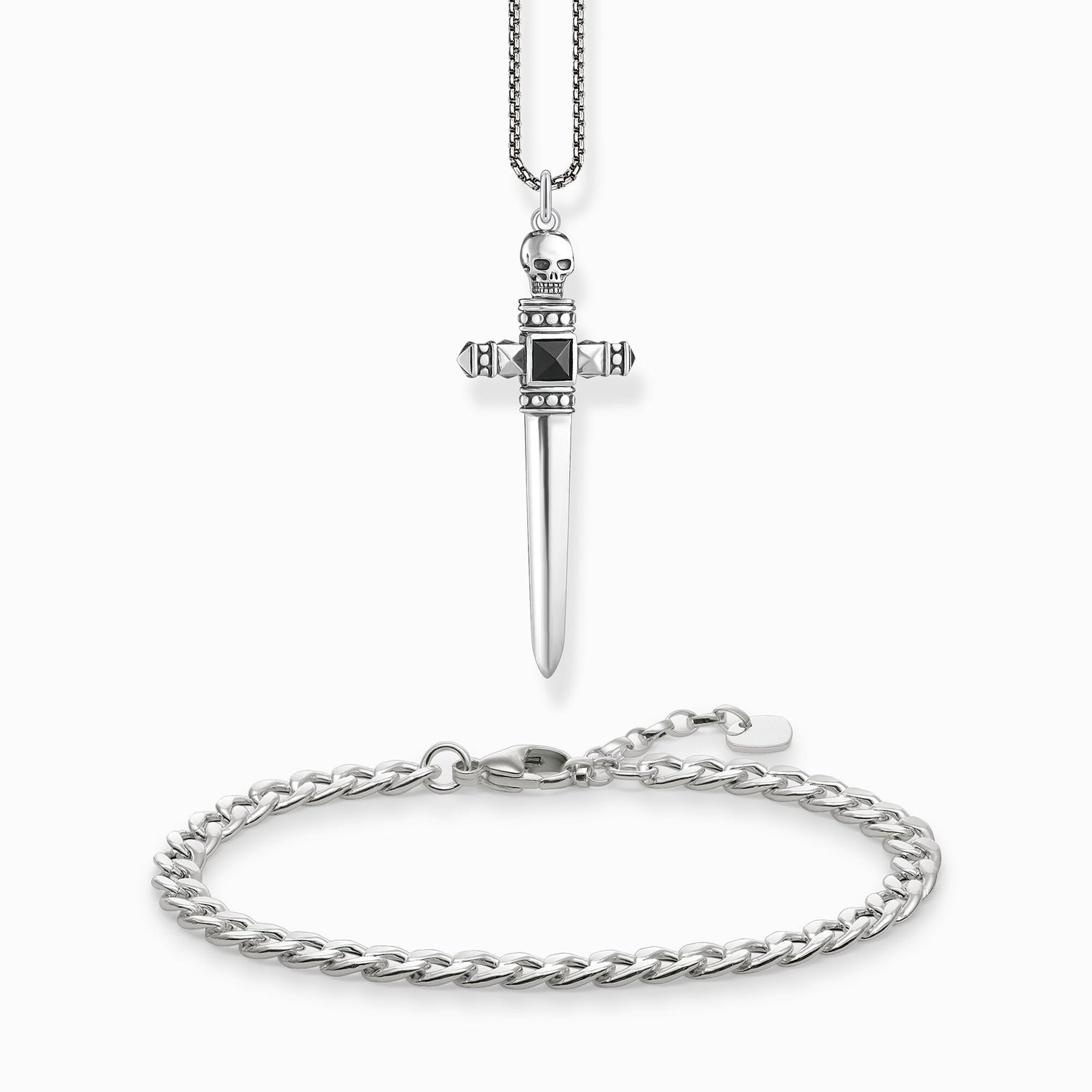 For courageous rebels: THOMAS SABO men’s necklace with detailed pendant made from 925 Sterling silver. The sword-shaped pendant is handcrafted in exclusive three-dimensional design and decorated with fine details. The sword’s handle is crowned by a skull and in the middle of the cross-guard a deep-black onyx stone in pyramid-cut completes the piece of jewellery. The sword pendant is attached to the necklace by an eyelet so it can move freely and also can be worn separately.