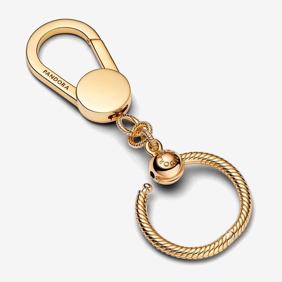 Add sparkle to your tote, cross-body or rucksack with the Pandora Moments Small Bag Charm Holder. Hand-finished with 14k gold plating, this popular charm holder features a small Pandora O Pendant. The flat disc of the lobster clasp can be engraved with your personal mantra. Style up to three of your favourite charms, dangles and pendants and make your bag a part of your story.
