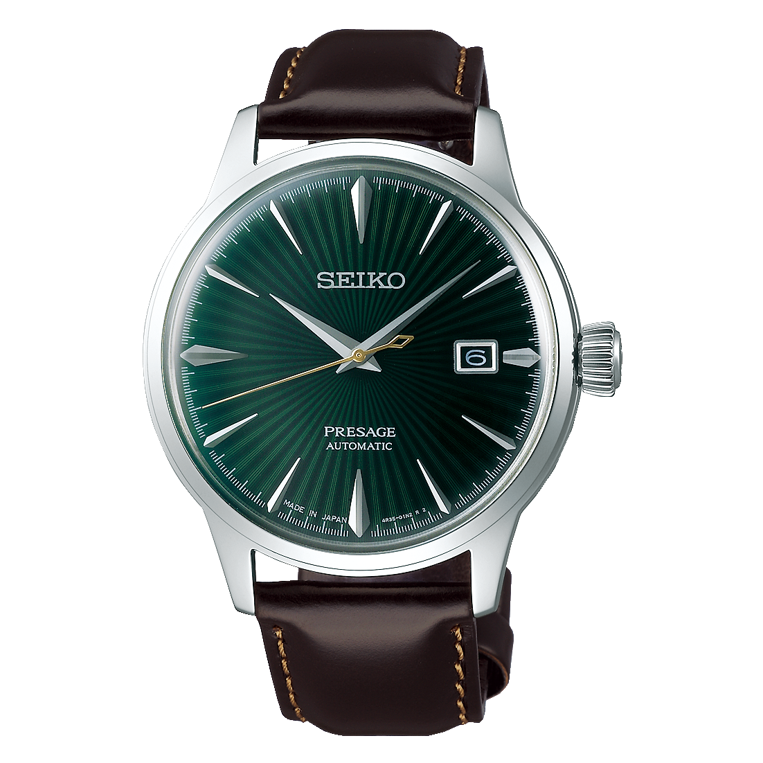 Seiko Presage Cocktail Time: ‘Mockingbird’ Inspired by Japanese cocktail culture and specific drinks from the Skybar in Tokyo’s sophisticated Ginza area. This watch is inspired by the Mockingbird cocktail with its vivid green colour, reflected in the dial design of this timepiece.