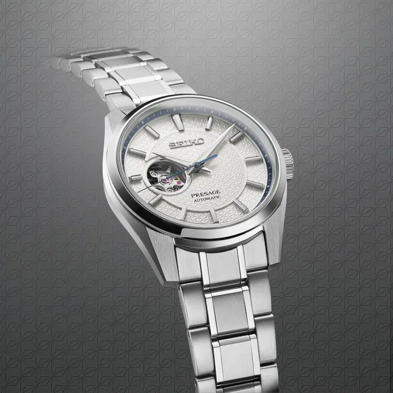 The dials on Presage Sharp Edged timepieces feature a traditional Japanese pattern designed to bring growth and success. This angular ancient hemp print has been seen in Japanese artisan objects since the Heian period (794-1185) and features on textiles and interior styles.