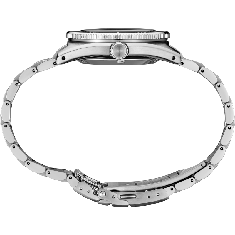 For this latest revival, the design is updated with a more sophisticated specification, heightened water resistance, and improved power reserve. Built in a 40mm stainless steel case, the sapphire crystal glass is surrounded by a deep ‘cove’ black bezel and matching dial. In line with professional ISO Diving specification, the hands and indices are coated in glow-in-the-dark Lumibrite whilst its upright date calendar in a 4.5 o’clock position also add to its legibility. For extra comfort and wearability, the bracelet has updated short pitch links and a shorter buckle. It is also slimmer than previous models, with a 13mm depth.