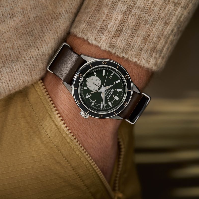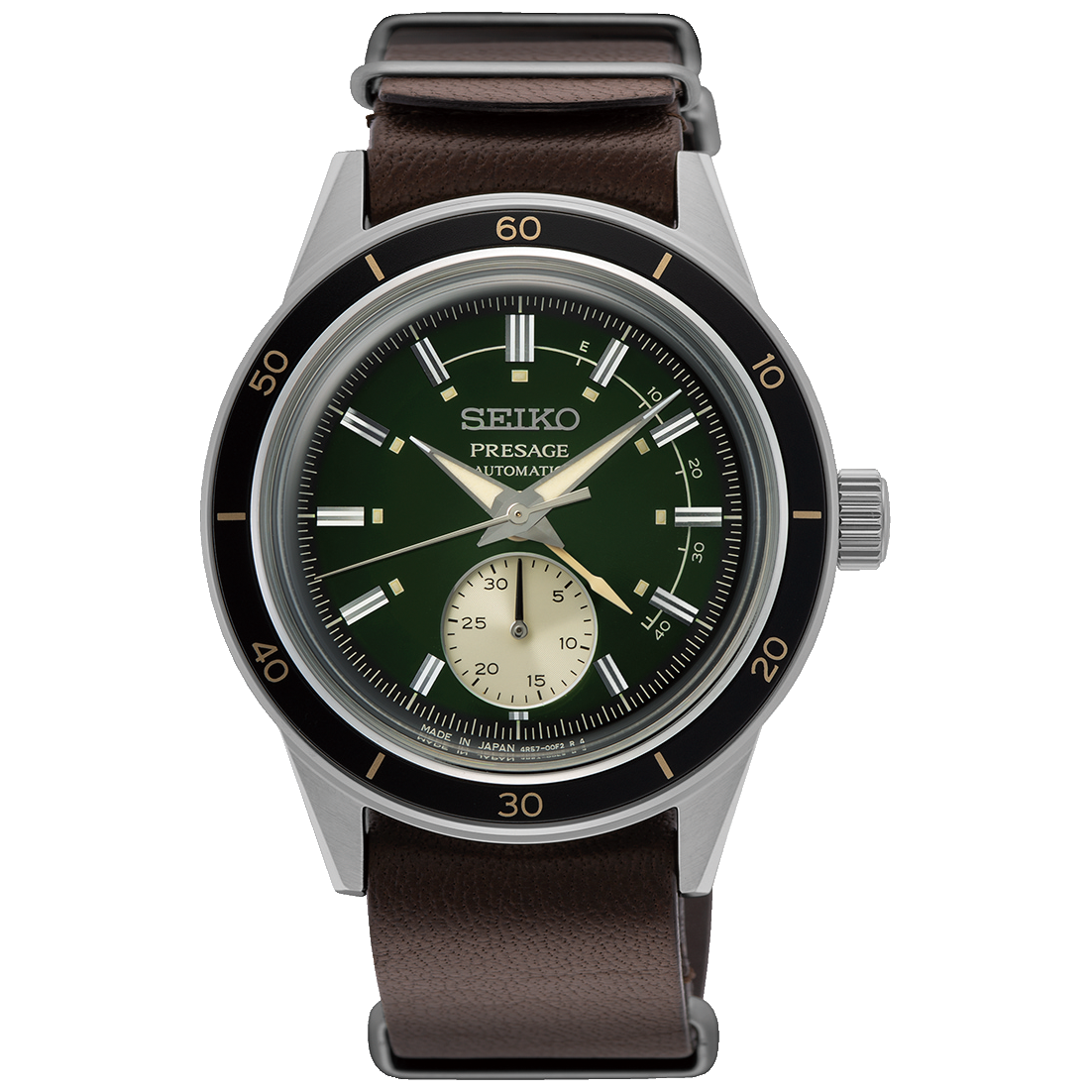 This Presage watch is the first in the Style 60s series to feature the 4R57 movement, with its characteristic sub-dial at the 6 o’clock position and two-colour base dial and sub-dial. The power-reserve hand and indicator positioned from twelve o’clock to four o’clock further emphasises its vintage style. This watch features a green dial along with a brown leather strap and for a true modern retro look.
