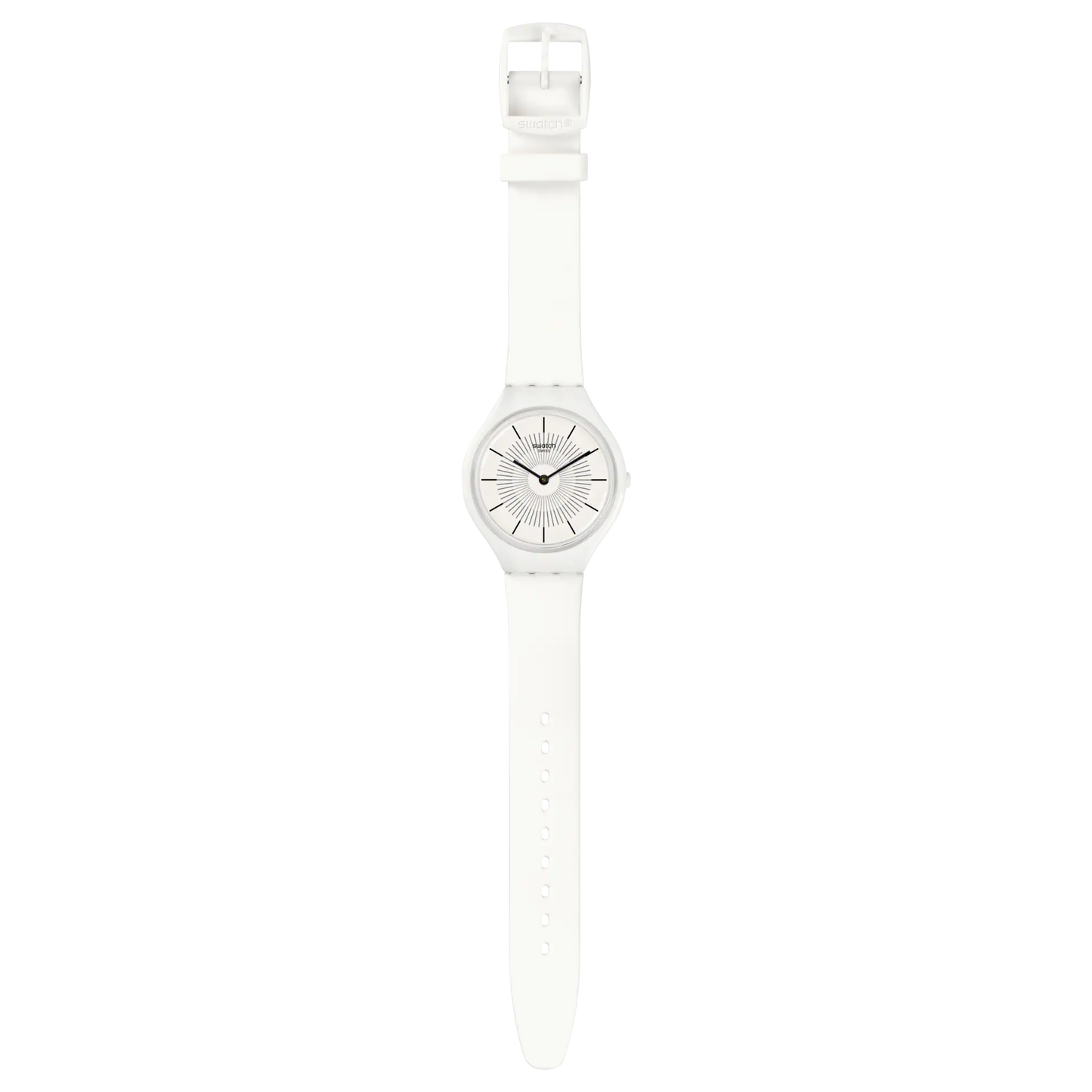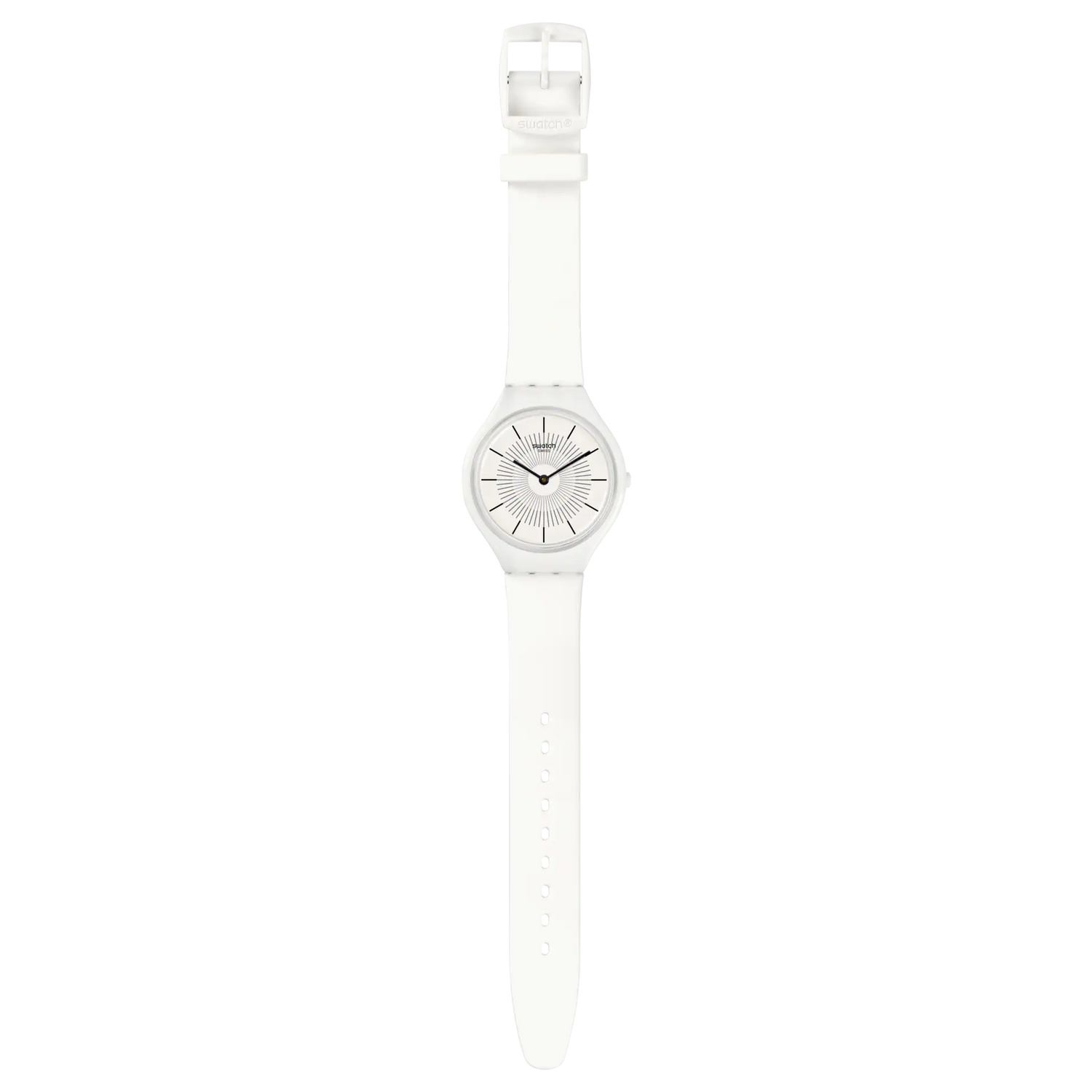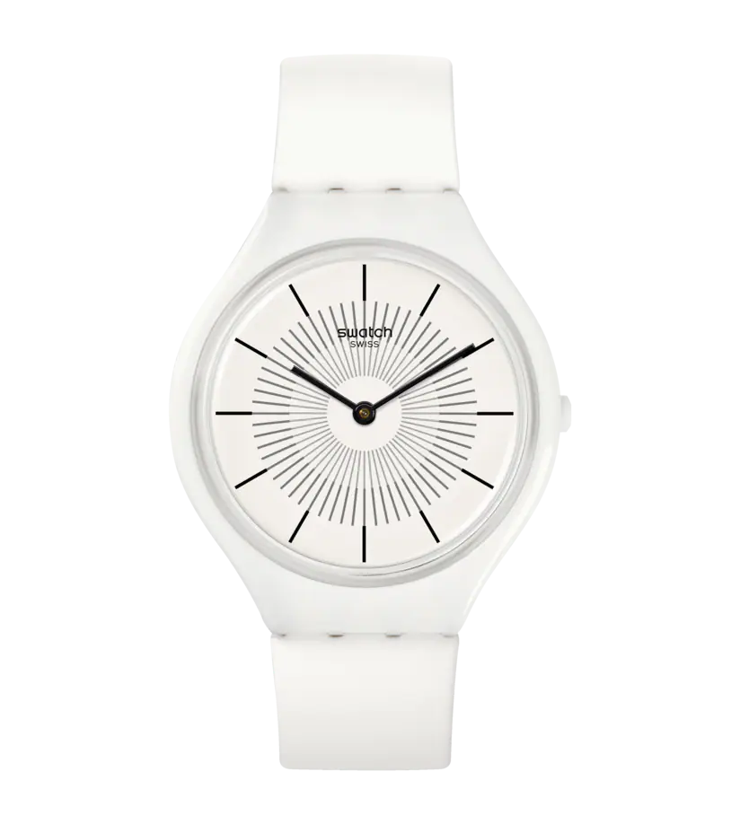 Exhibiting a low-profile ultra-thin Swatch case construction, the white dial features a black and gray print index. Its 36.8mm double-injection case is split along a curving line composed of a shiny white front and a shiny gray plastic back. The look comes together with a matte white silicone strap, white silicone loop and shiny white plastic buckle.