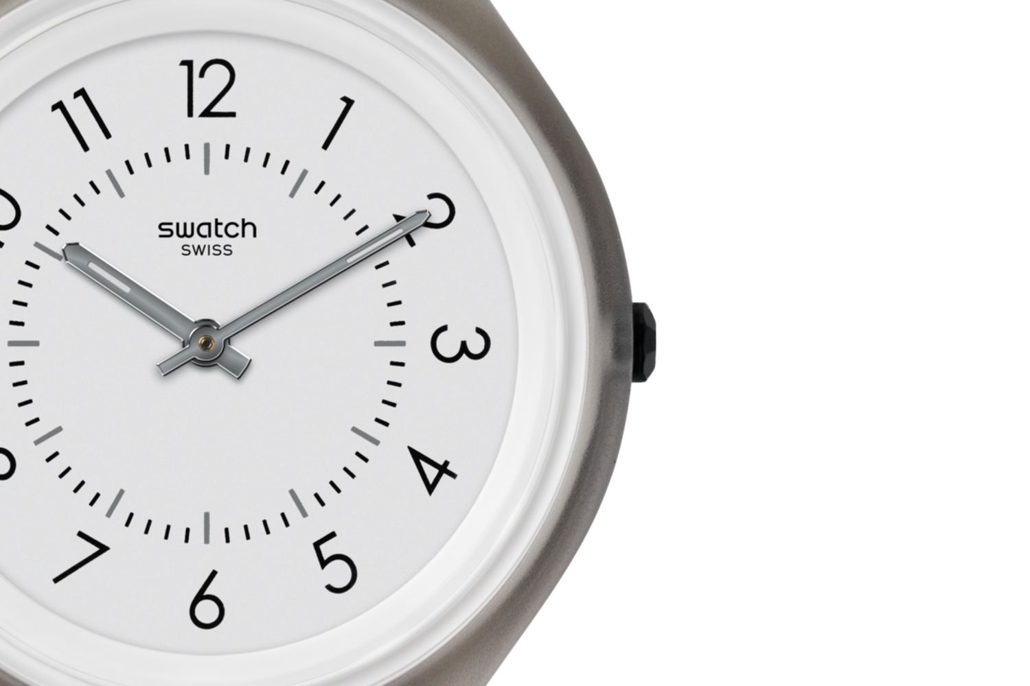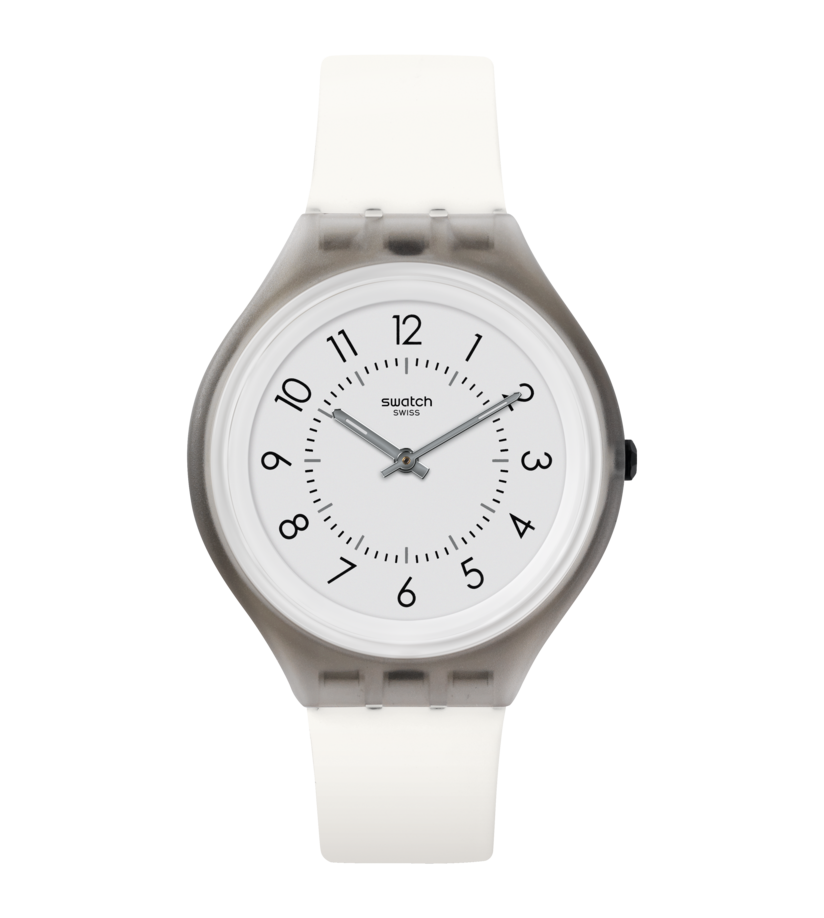 This ultra-slim Swatch Skinclass watch is made from plastic/resin and is powered by a quartz movement. It fastens a white rubber strap and has a white dial.