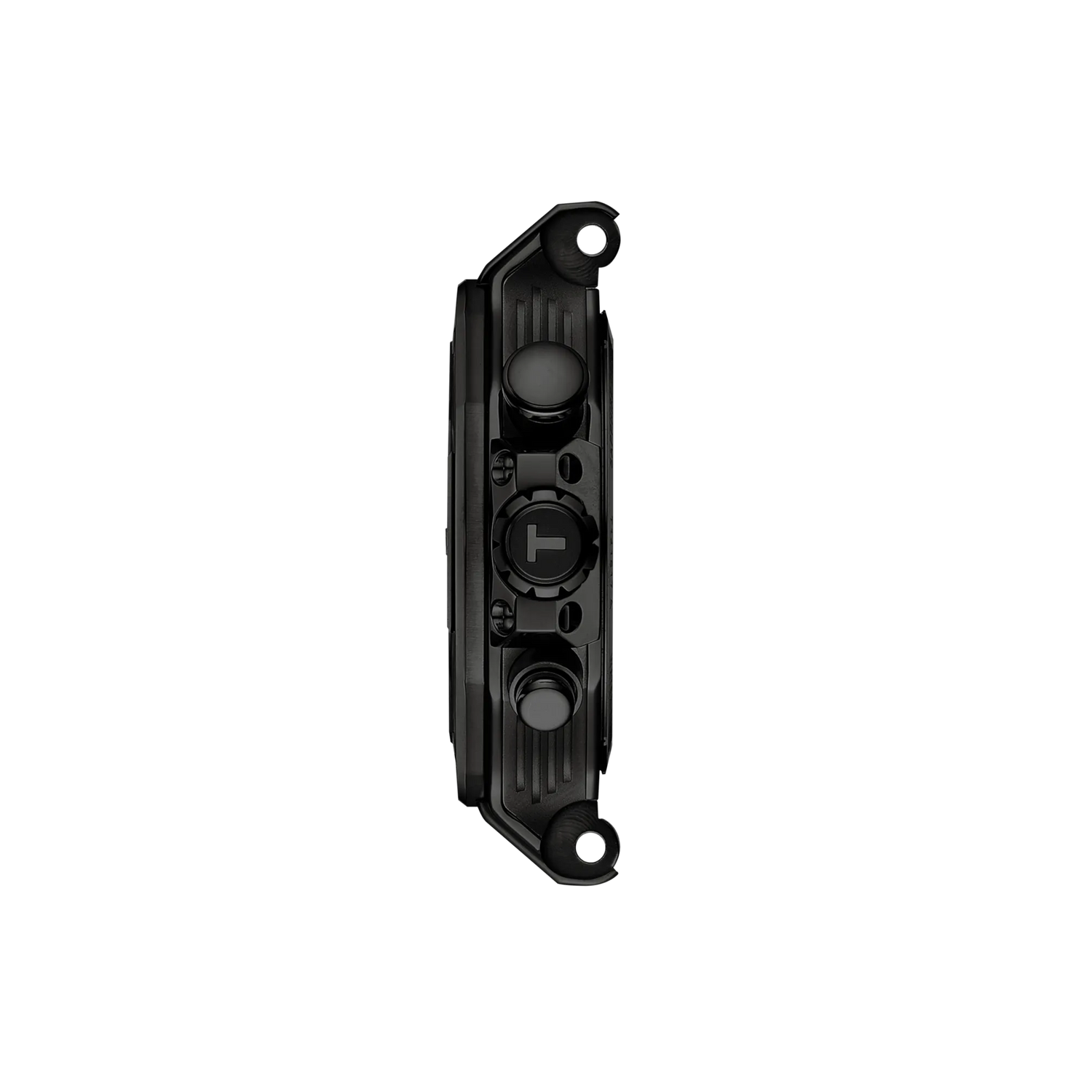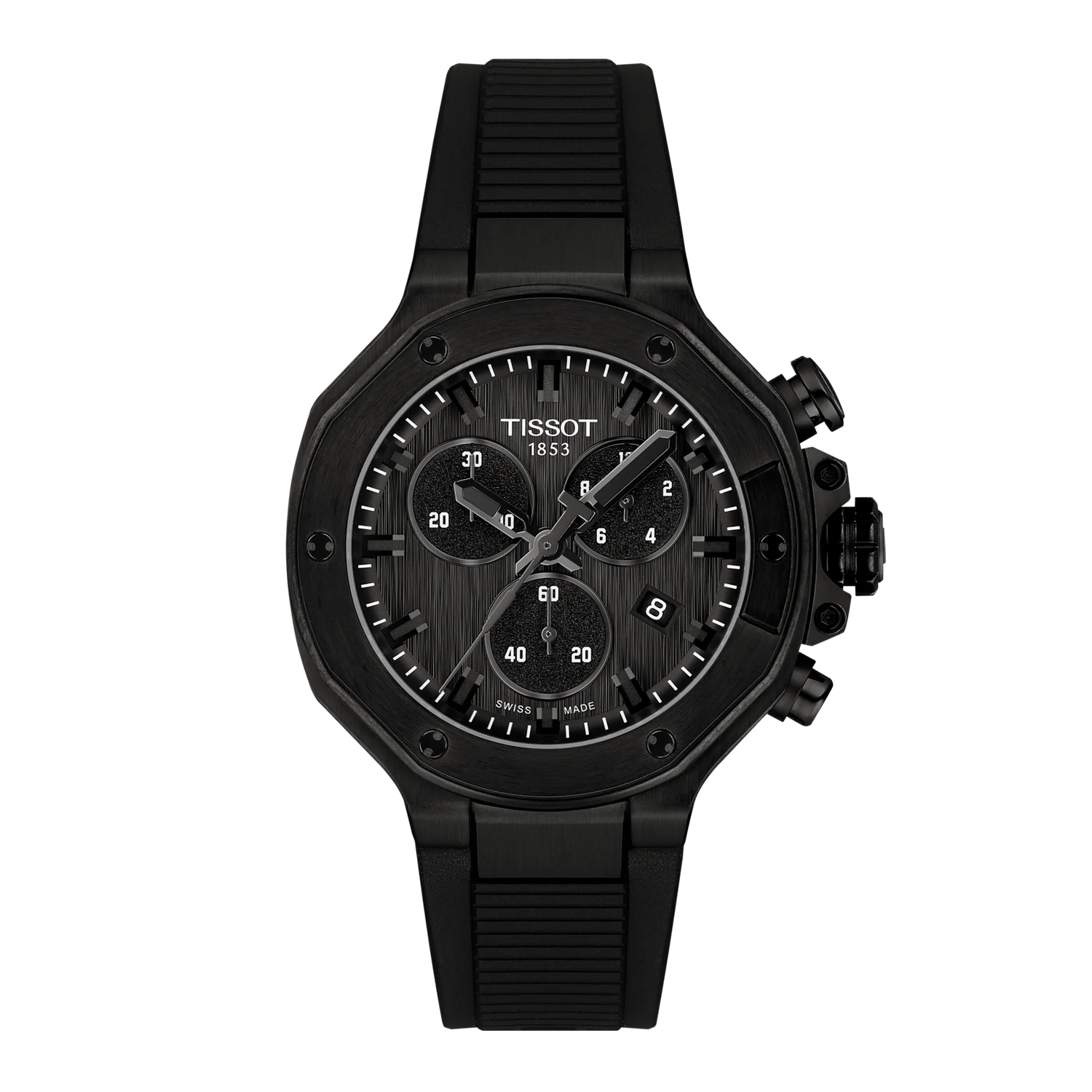Tissot has drawn inspiration from its partnership with motorcycle racing to create a watch that reflects the dynamism of motorcycles and the emotion of the sport... The T-Race collection immerses the wearer in a mechanical environment and awakens the spirit. The bezel resembles a brake disc, the pushers are inspired by handlebars, and the cooling fins of an engine are reproduced on the side of the case. The watch is water-resistant to 10 bar (100 m) and equipped with a quartz chronograph movement.